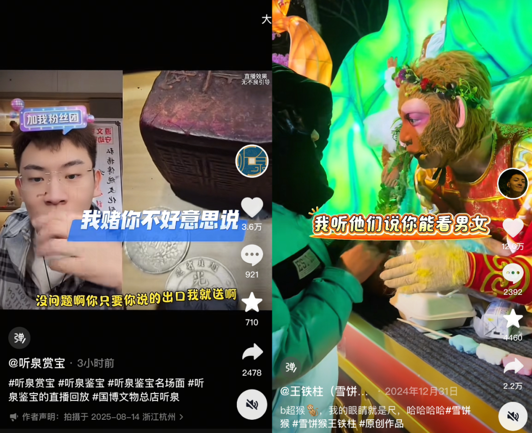 当下无论你是搞什么赛道的网红,能在你所处的赛道玩出新花样、玩癫玩抽象的网红都不简单。比如听泉赏宝,走红肇始于从早年《鉴宝》节目严肃调性里另辟了一条脱口秀式娱乐鉴宝的抽象路子;比如王铁柱雪饼猴,师从赵四刘晓光却没走赵家班老路的他因为在长春动植物园扮“雪饼猴”与路人接地气互动而彻底走红。这些新生代网红与时俱进、好学努力、不走寻常路,日渐进步的他们成功取代老网红们站上了流量C位。