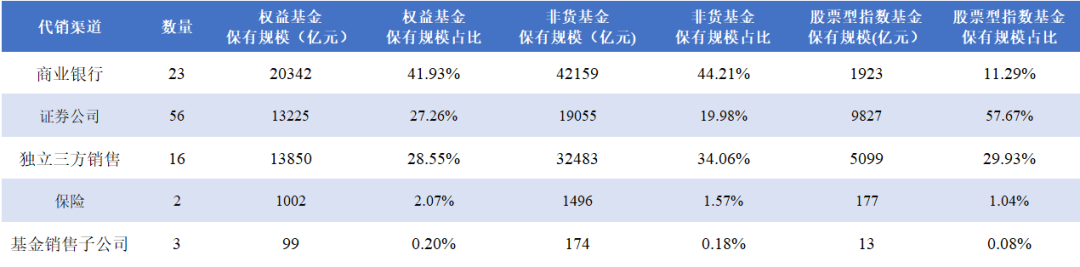 此后直销的份额进一步被代销蚕食。根据中基协发布的2024年下半年基金销售机构公募基金销售保有规模,截至2024年四季度末,前100家基金代销机构中,银行、券商、第三方代销机构、基金销售子公司和保险公司分别有23家、56家、16家、3家、2家。其中,银行渠道的非货基金保有规模为4.22万亿元,第三方代销平台为3.24万亿元,券商为1.91万亿元。华创证券非银首席分析师徐康指出,国内公募基金销售模式以代销机构为驱动,代销规模高于70%-80%,占据主导地位。