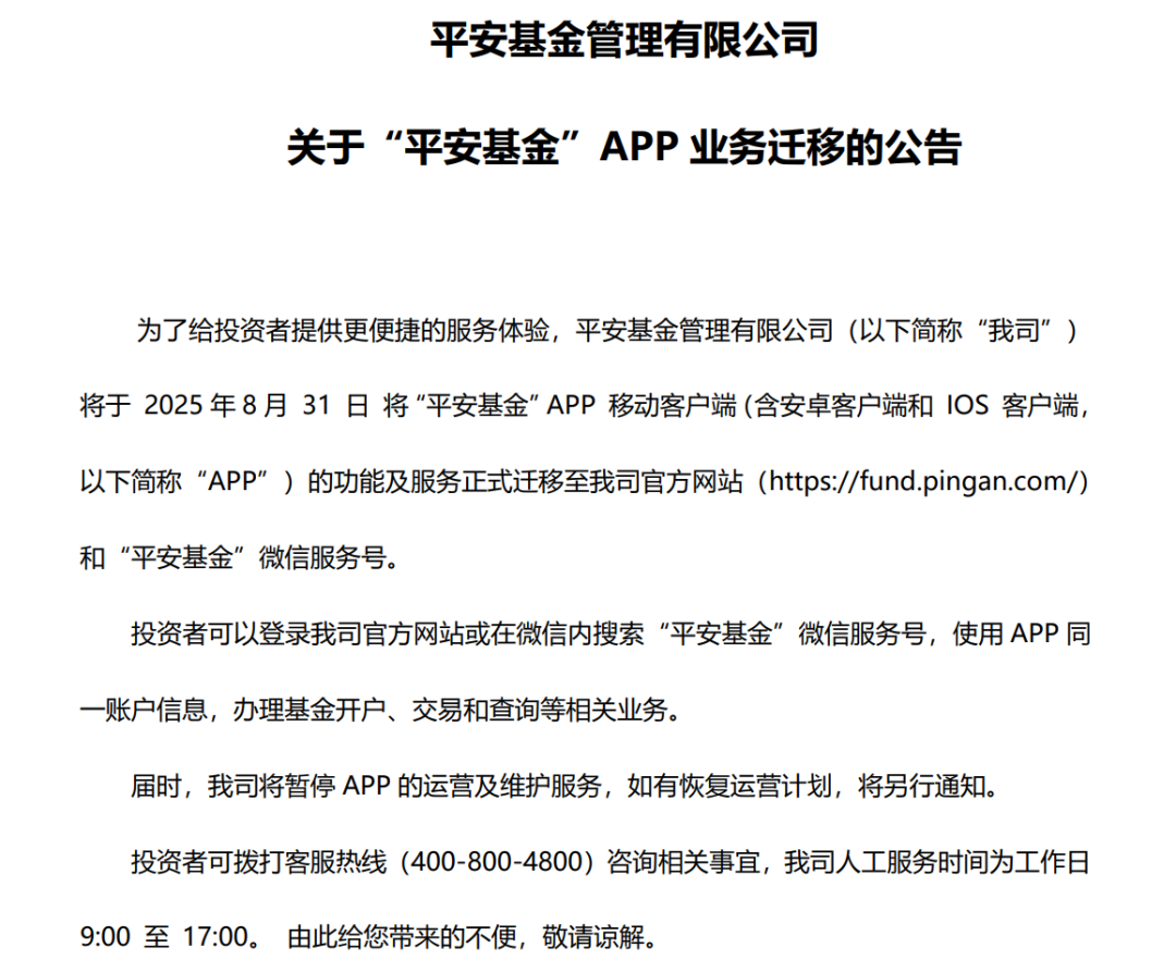近期,平安基金称将在8月末将暂停APP的运营及维护服务,如有恢复运营计划,另行通知,而APP上的功能以及服务迁移至官网和“平安基金”微信公众号。
