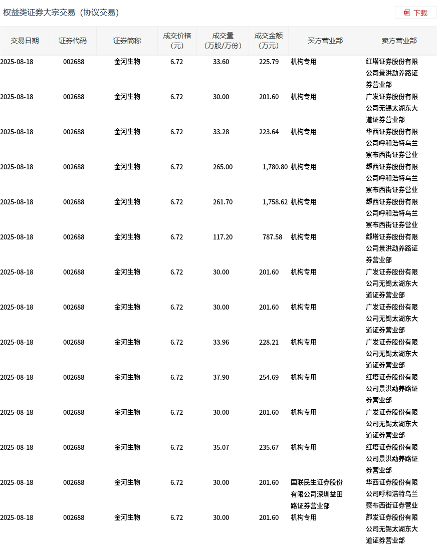 8月18日,金河生物大宗交易成交997.71万股,成交额6704.6万元,占当日总成交额的16.81%,成交价6.72元,较市场收盘价7.5元折价10.4%。