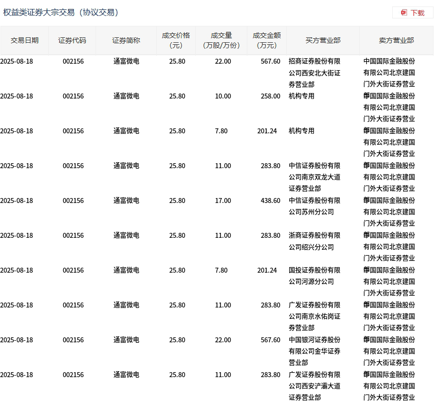 8月18日,通富微电大宗交易成交130.6万股,成交额3369.48万元,占当日总成交额的1.13%,成交价25.8元,较市场收盘价29.55元折价12.69%。