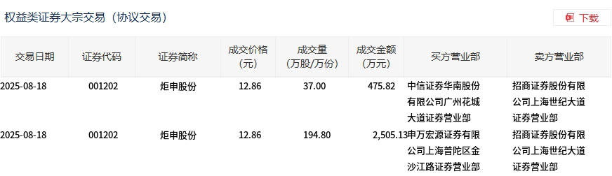 8月18日,炬申股份大宗交易成交231.8万股,成交额2980.95万元,占当日总成交额的27.87%,成交价12.86元,较市场收盘价15.72元折价18.19%。