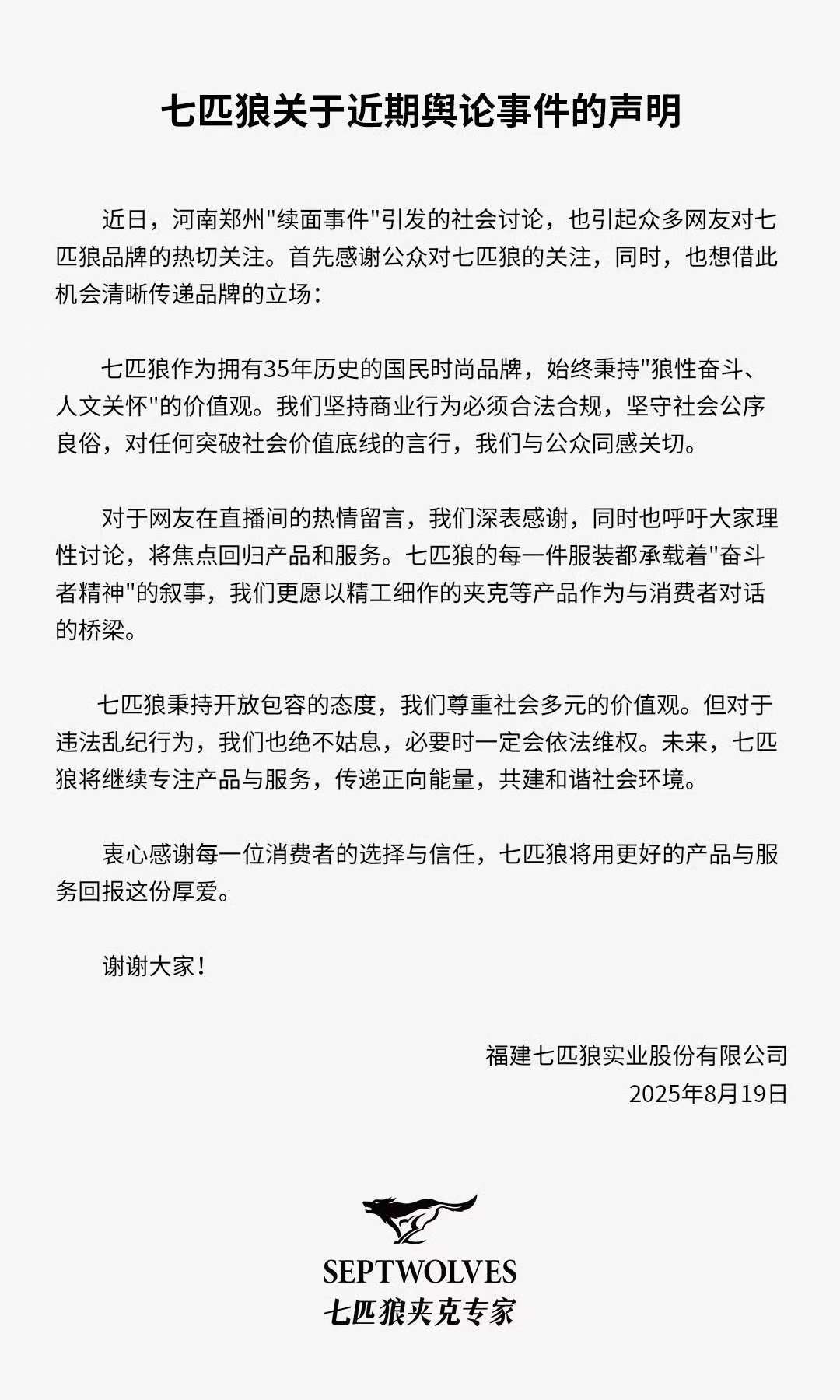 8月19日,七匹狼就近期舆论事件发布声明称,河南郑州“续面事件”引发社会讨论,也引起众多网友对七匹狼品牌的热切关注。“感谢公众对七匹狼的关注,同时也借此机会清晰传递品牌的立场:我们坚持商业行为必须合法合规,坚守社会公序良俗,对任何突破社会价值底线的言行,我们与公众同感关切。”