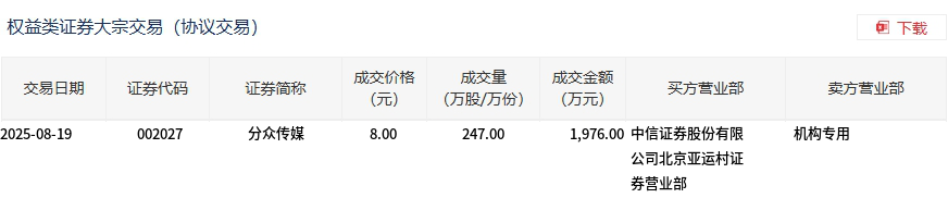 分众传媒今日大宗交易溢价成交247万股,成交额1976万元