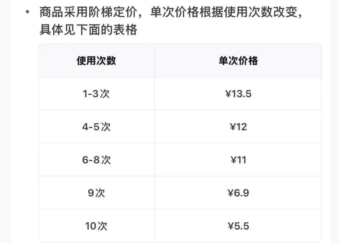 一种是阶梯次卡,比如瑞幸咖啡的超划算10次卡,售价89.9元,单次价格根据使用次数改变,其中1-3次的单价是13.5元,后面逐步下降,到第10次时,单价只需要5.5元。