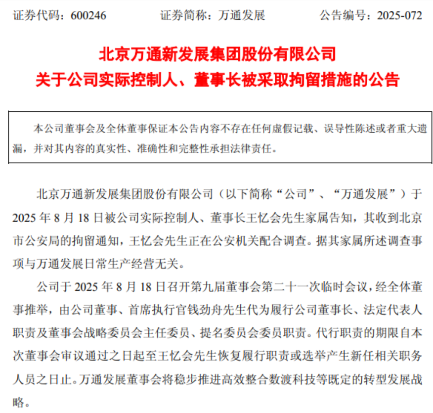 8月18日晚间,一则公告震动资本市场——71岁的万通发展董事长王忆会被北京市公安局采取拘留措施,正在公安机关配合调查。