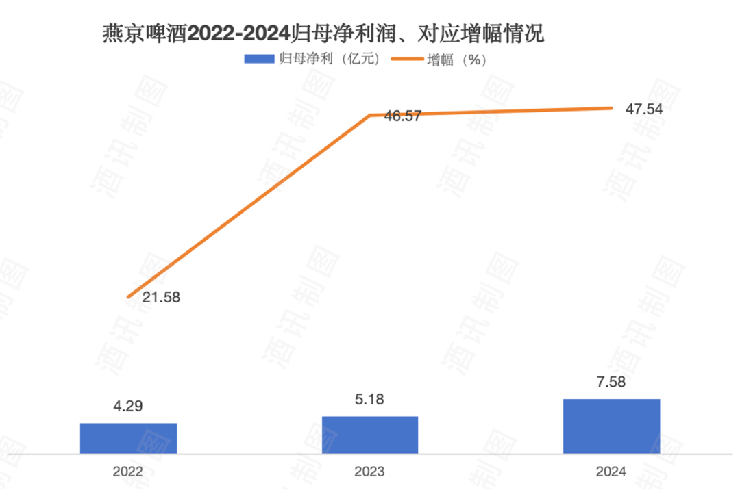 回顾过去三年的中报数据,燕京啤酒分别在2022年、2023年、2024年实现归母净利润4.29亿元、5.18亿元、7.58亿元,对应增幅为21.58%、46.57%、47.54%。2025年上半年,燕京啤酒11.03亿元的净利润不仅取得了较高增速,也已超过2024年全年10.56亿元的水平。