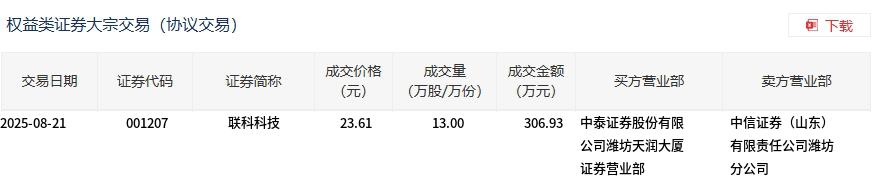 8月21日,联科科技大宗交易成交13万股,成交额306.93万元,占当日总成交额的2.94%,成交价23.61元,较市场收盘价25.89元折价8.81%。