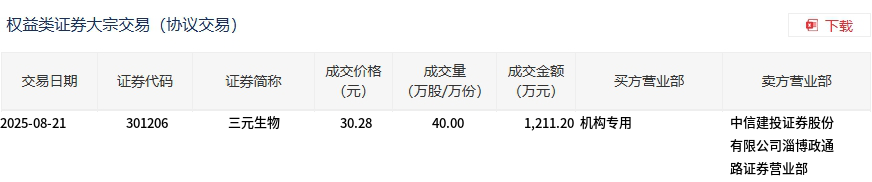 8月21日,三元生物大宗交易成交40万股,成交额1211.2万元,占当日总成交额的5.24%,成交价30.28元,较市场收盘价30.59元折价1.01%。