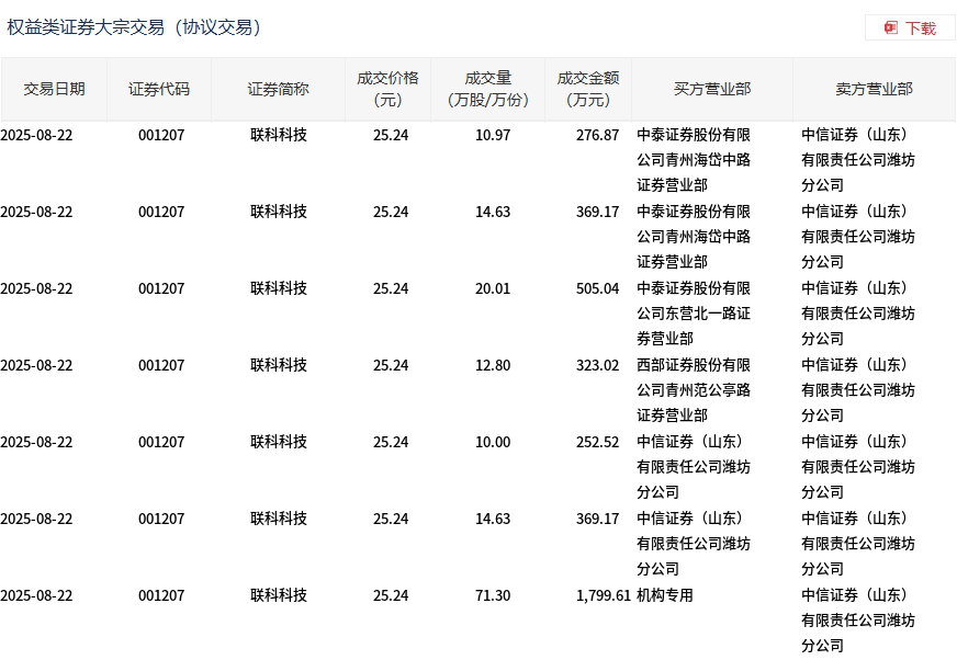 联科科技今日大宗交易折价成交154.34万股,成交额3895.4万元