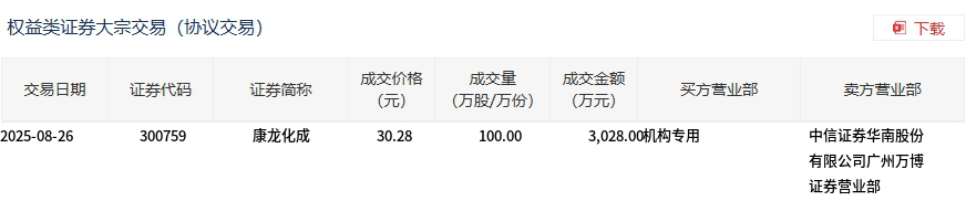 8月26日,康龙化成大宗交易成交100万股,成交额3028万元,占当日总成交额的1.84%,成交价30.28元,较市场收盘价30.52元折价0.79%。