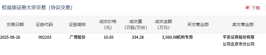 8月26日,广博股份大宗交易成交334.28万股,成交额3560.08万元,占当日总成交额的12.86%,成交价10.65元,较市场收盘价10.73元折价0.75%。