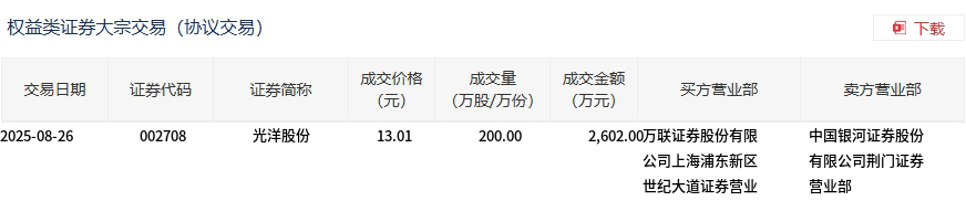 8月26日,光洋股份大宗交易成交200万股,成交额2602万元,占当日总成交额的6.2%,成交价13.01元,较市场收盘价13.14元折价0.99%。
