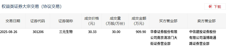 8月26日,三元生物大宗交易成交30万股,成交额909.9万元,占当日总成交额的6.84%,成交价30.33元,较市场收盘价30.64元折价1.01%。