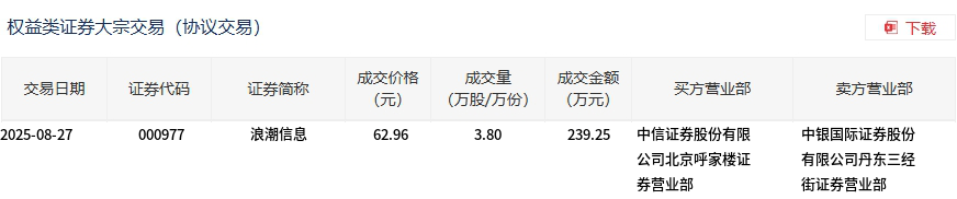 8月27日,浪潮信息大宗交易成交3.8万股,成交额239.25万元,占当日总成交额的0.02%,成交价62.96元,较市场收盘价66.28元折价5.01%。