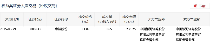 粤桂股份今日大宗交易折价成交19.65万股,成交额233.25万元