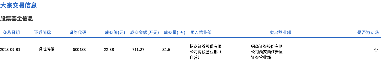 通威股份今日大宗交易平价成交31.5万股,成交额711.27万元