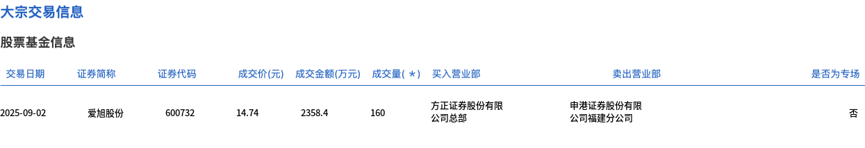 9月2日,爱旭股份大宗交易成交160万股,成交额2358.4万元,占当日总成交额的3.27%,成交价14.74元,较市场收盘价14.89元折价1.01%。