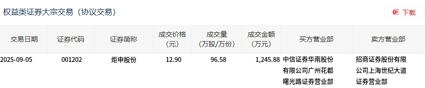 9月5日,炬申股份大宗交易成交96.58万股,成交额1245.88万元,占当日总成交额的20.25%,成交价12.9元,较市场收盘价14.58元折价11.52%。