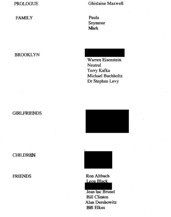 除了貌似有特朗普签名的庆生信,众议院监督委员会还放出了爱泼斯坦50岁生日的纪念册扫描件。纪念册首页的“朋友”一栏中有美国民主党前总统克林顿的名字,以及特朗普的前律师德肖维茨、英国驻美国大使曼德尔森、维多利亚的秘密母公司的首席执行官卫克斯奈。