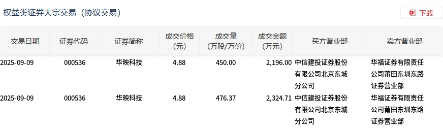 - 华映科技今日大宗交易折价成交1000万股,成交额5060万元