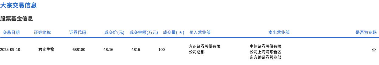9月10日,君实生物大宗交易成交100万股,成交额4816万元,占当日总成交额的4.52%,成交价48.16元,较市场收盘价48.5元折价0.7%。