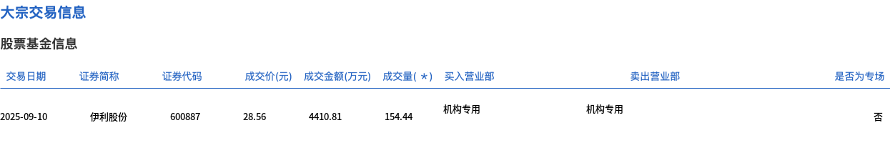 9月10日,伊利股份大宗交易成交154.44万股,成交额4410.81万元,占当日总成交额的2.43%,成交价28.56元,较市场收盘价28.43元溢价0.46%。