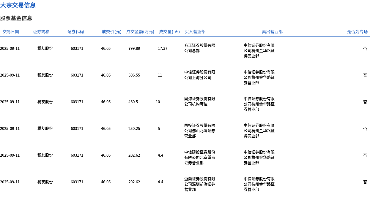 9月11日,税友股份大宗交易成交52.17万股,成交额2402.43万元,占当日总成交额的9.13%,成交价46.05元,较市场收盘价51.1元折价9.88%。