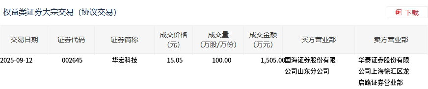 华宏科技今日大宗交易折价成交100万股,成交额1505万元