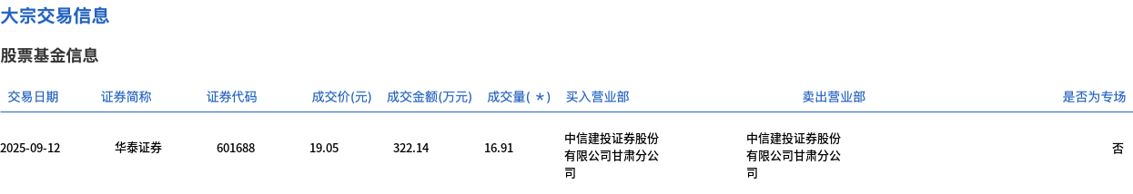 9月12日,华泰证券大宗交易成交16.91万股,成交额322.14万元,占当日总成交额的0.18%,成交价19.05元,较市场收盘价20.78元折价8.33%。