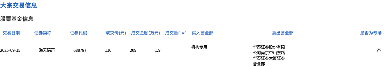 9月15日,海天瑞声大宗交易成交1.9万股,成交额209万元,占当日总成交额的0.7%,成交价110元,较市场收盘价125.62元折价12.43%。