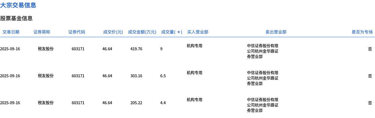 9月16日,税友股份大宗交易成交19.9万股,成交额928.14万元,占当日总成交额的3.07%,成交价46.64元,较市场收盘价53.03元折价12.05%。