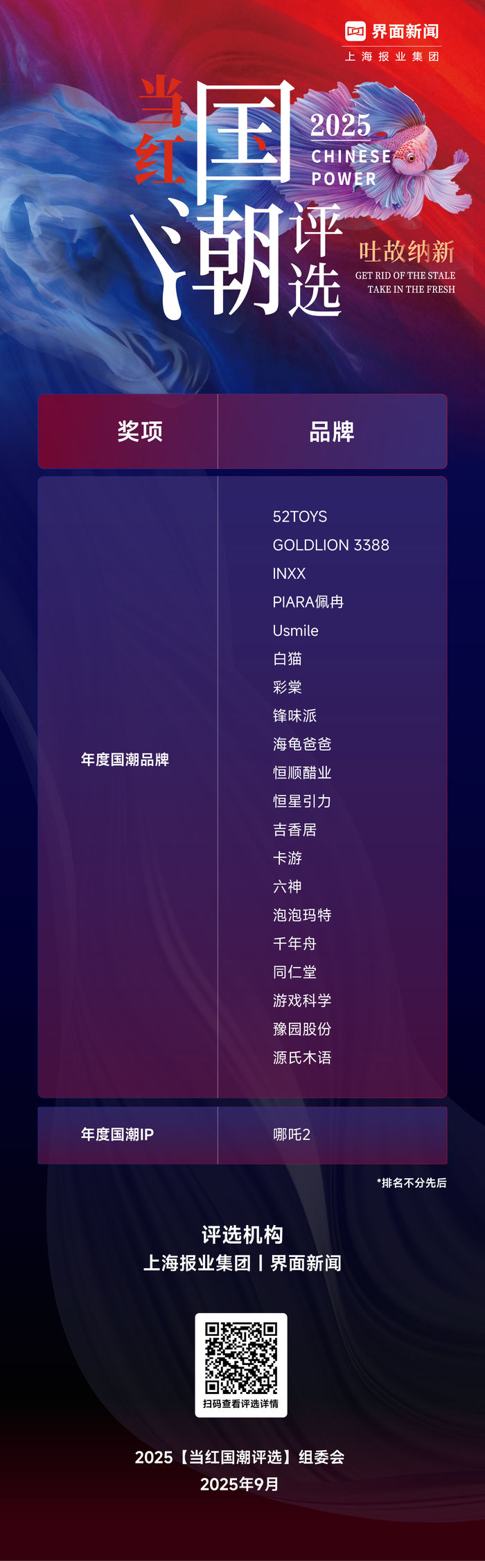 在这个充满希望的年份,2025【当红国潮评选】再度启航,旨在深入挖掘并表彰那些能够精准捕捉国潮美学精髓,成功融合传统与现代,以创新精神激活古老文化生命力的品牌。本次评选不仅是对过去一年国潮品牌辉煌成就的回顾,更是对未来国潮发展趋势的一次前瞻,鼓励更多品牌以更加开放的姿态,探索国潮美学的无限可能,共同书写东方美学新篇章,让国潮之光继续闪耀全球。9月24日,由上海报业集团|界面新闻主办的2025【当红国潮评选】颁奖典礼顺利落下帷幕。经过层层环节筛选,最终20个品牌荣膺年度国潮品牌、1个品牌荣膺年度国潮IP。