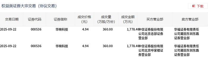 - 华映科技今日大宗交易折价成交1000万股,成交额5060万元