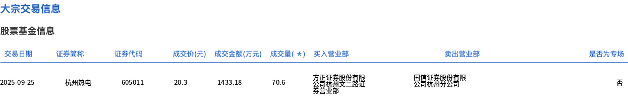 9月25日,杭州热电大宗交易成交70.6万股,成交额1433.18万元,占当日总成交额的9.06%,成交价20.3元,较市场收盘价21.75元折价6.67%。