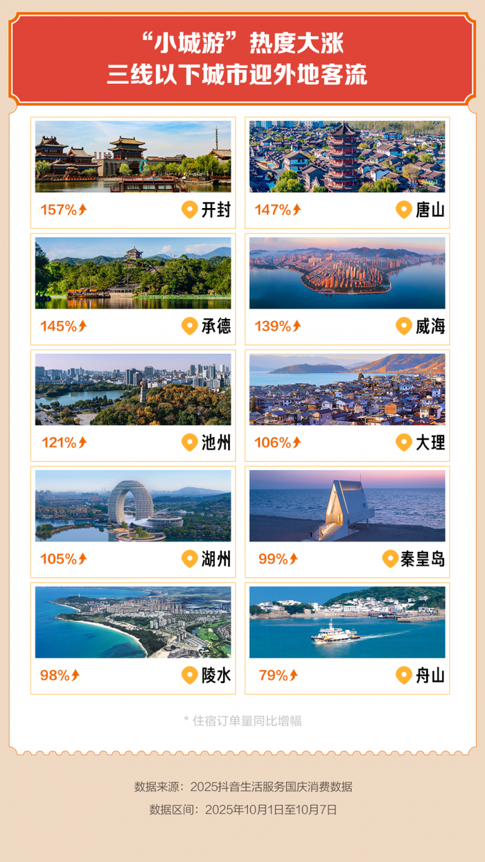 在出游目的地方面,平台数据显示,更具地方特色的小城颇受欢迎,当地住宿需求大幅增加。10月1日至10月7日,开封、唐山、承德抖音住宿团购订单分别同比增长157%、147%、145%,威海、池州、大理、湖州均实现翻倍增长,秦皇岛、陵水、舟山也分别增长了99%、98%和79%。
