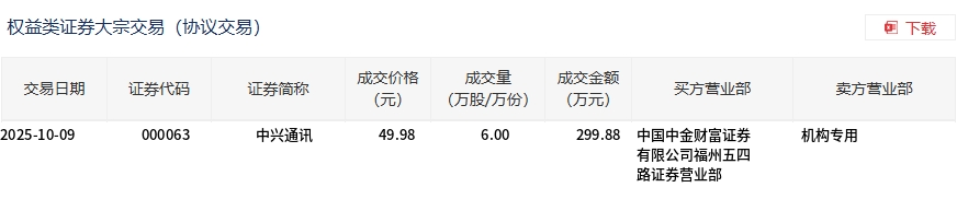 中兴通讯今日大宗交易平价成交6万股,成交额299.88万元
