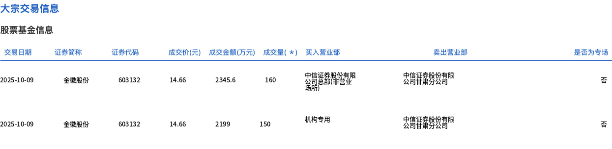 10月9日,金徽股份大宗交易成交310万股,成交额4544.6万元,占当日总成交额的20.13%,成交价14.66元,较市场收盘价14.96元折价2.01%。