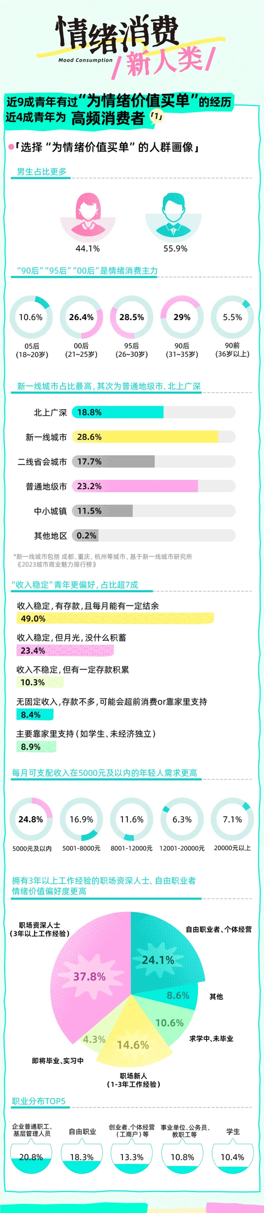 数据显示,近9成青年有过“为情绪价值买单”的经历,近4成青年为高频消费者。选择为情绪价值买单的人群中,男生占比55.9%,女生占比44.1%;“90后”“95后”“00后”是情绪消费主力;新一线城市需求最盛(28.6%),其次为普通地级市(23.2%)、北上广深(18.8%)。