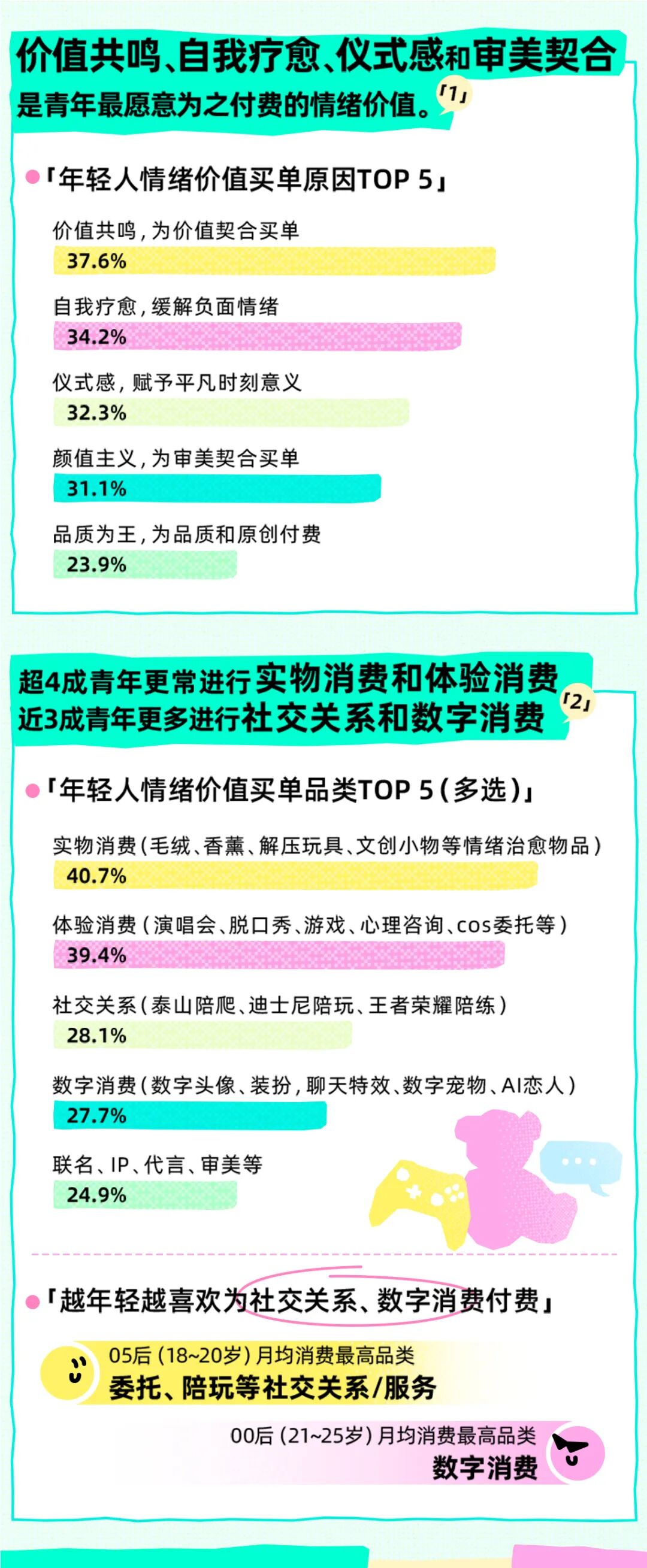 有数数据创新实验室分析认为,年轻人对情绪价值的高度认可和依赖,深刻反映了Z世代在当前社会文化背景下的普遍心理诉求。学业竞争、职场内卷、社交焦虑以及对未来的不确定性,共同塑造了他们强烈的获取情感连接、寻求认同理解的内在驱动力。情绪价值已从短暂的“感受性慰藉”,跃升为年轻人维系心理健康和生活动力的“能量补给源”。“情绪价值驱动消费”已成为Z世代消费市场的核心引擎之一,其影响力仍在快速扩大。
