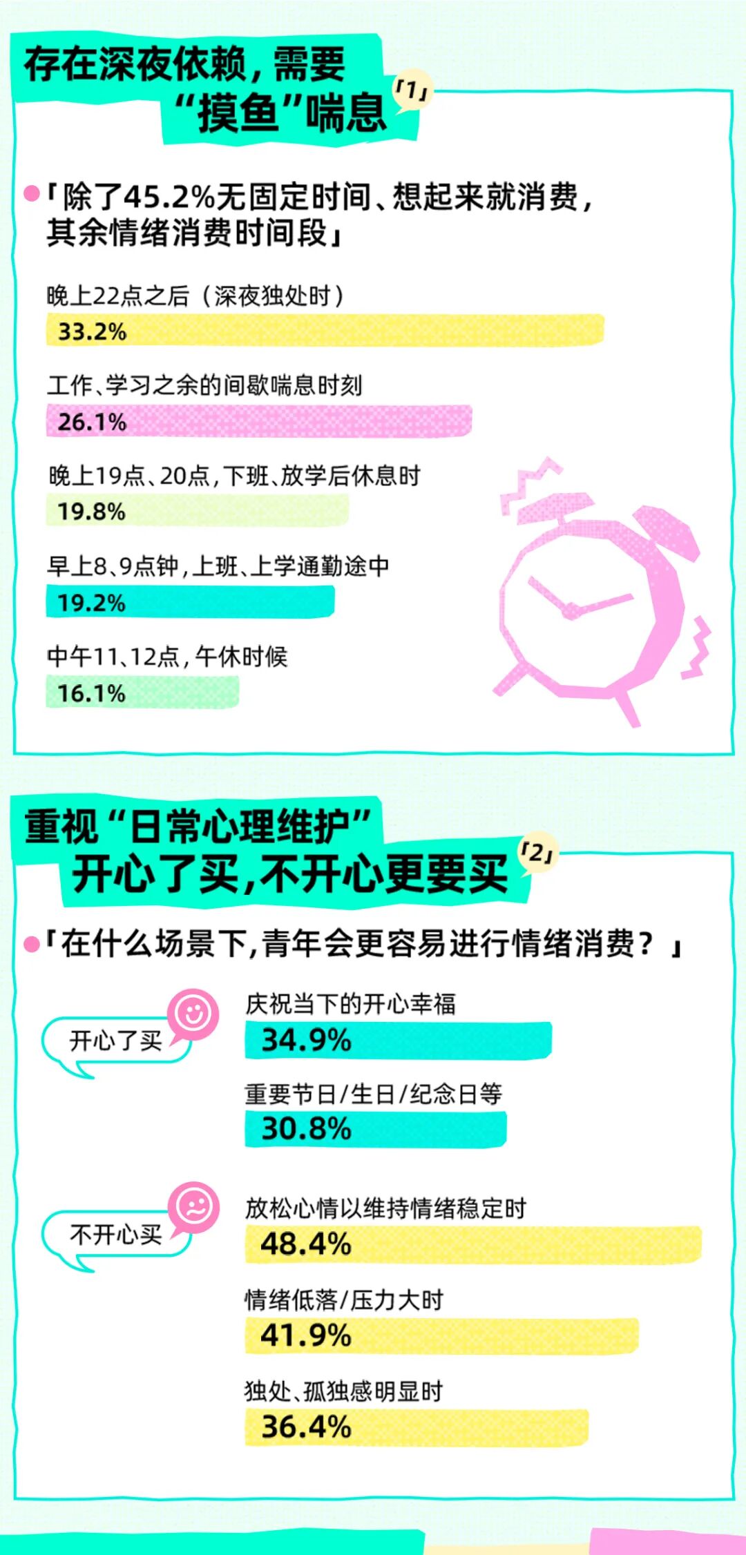 超半数存在规律时段依赖,深夜22点后(33.2%)与工作间歇喘息时刻(26.1%)成两大峰值,通勤、午休等碎片时间也被密集填充。青年热衷情绪消费兼具“心理维护”双轨性,或为了“消极维护”,48.4%主动消费以维稳情绪,41.9%在情绪低谷时触发,36.4%由独处孤独引发;或为了“积极强化”,34.9%为了庆祝当下的开心幸福,30.8%为了庆祝重要节日、生日、纪念日。