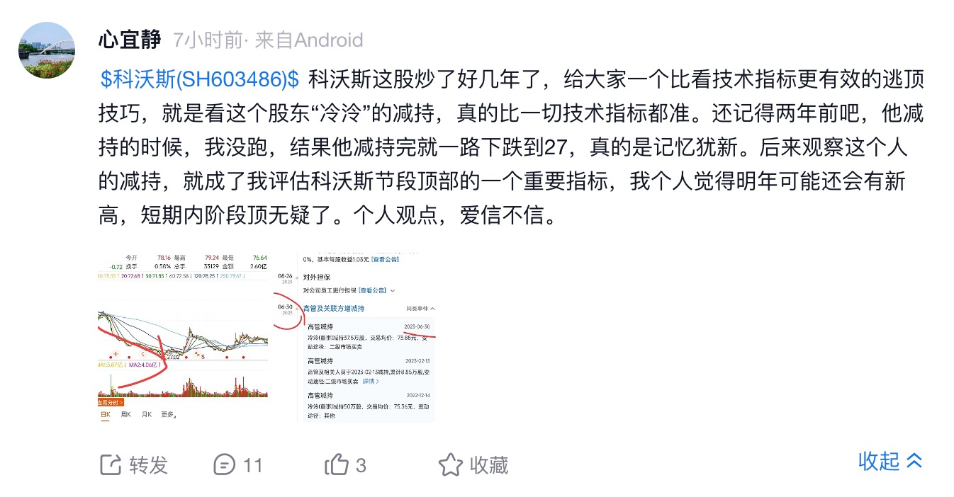 雪球平台上有观点认为,冷泠的减持可能意味着当前阶段科沃斯达到了阶段高点。其中一位网友提到,冷泠减持是对科沃斯最准确的判断之一,并且23年6月冷泠减持37.5万股,减持价格为73.88元。