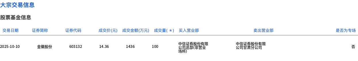10月10日,金徽股份大宗交易成交100万股,成交额1436万元,占当日总成交额的8.33%,成交价14.36元,较市场收盘价14.51元折价1.03%。