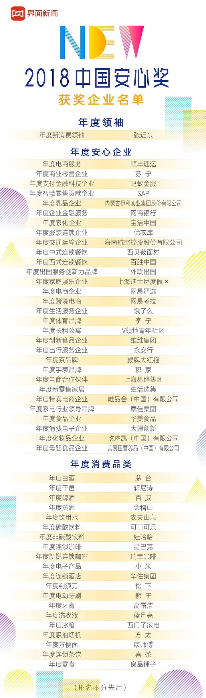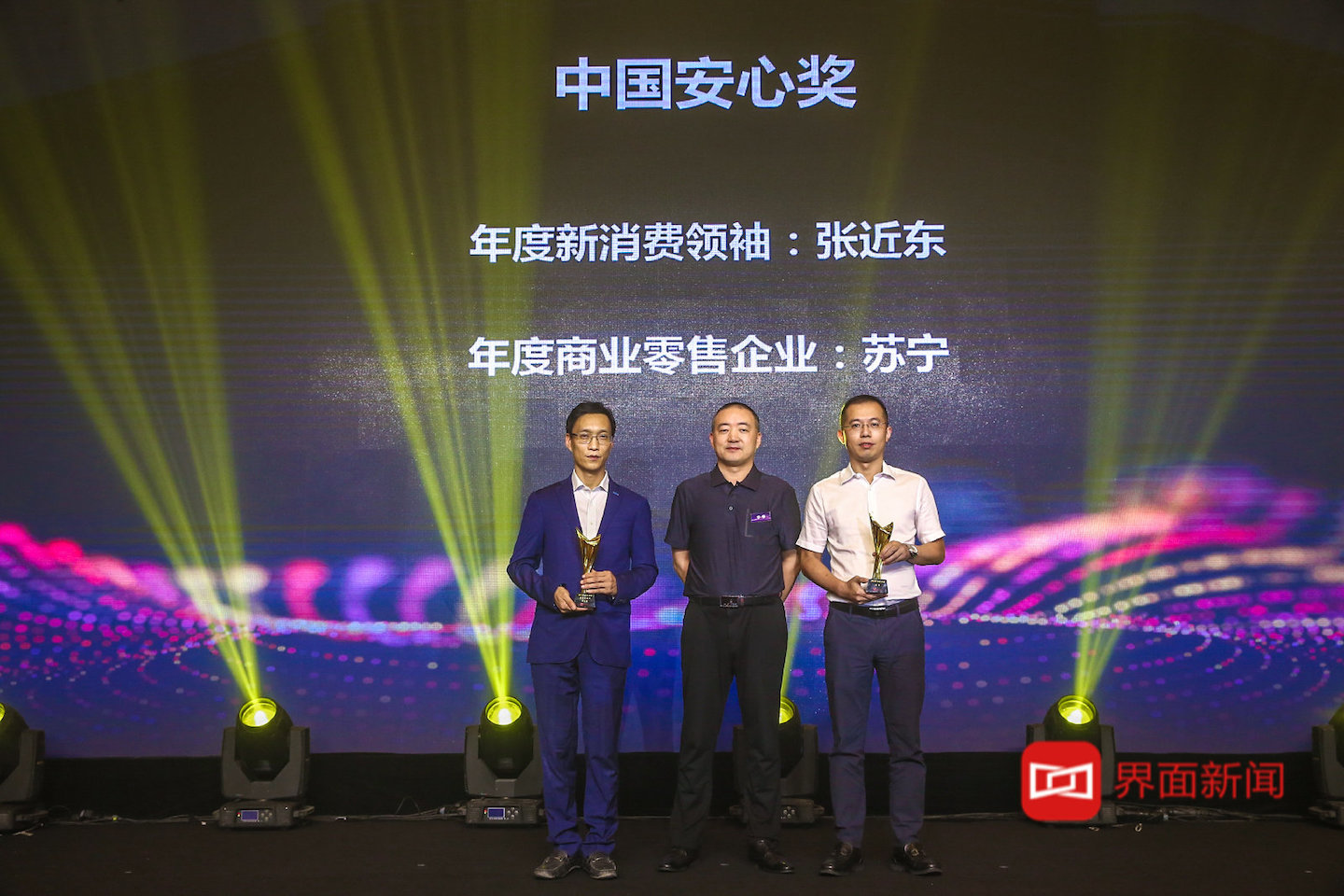 在最受瞩目的“年度领袖”评选中,苏宁易购集团董事长张近东先生获得“年度新消费领袖”个人大奖。苏宁、SAP、伊利集团、优衣库、外联出国等30家年度安心企业,以年度营收、市场占有率、产品创新、品牌认知、消费者评价等全方面的综合优异表现,获得各自行业内的“年度安心企业”称号。茅台、农夫山泉、小米、方太、喜茶等20家企业以细分品类中的出色表现斩获“年度消费品类”大奖。