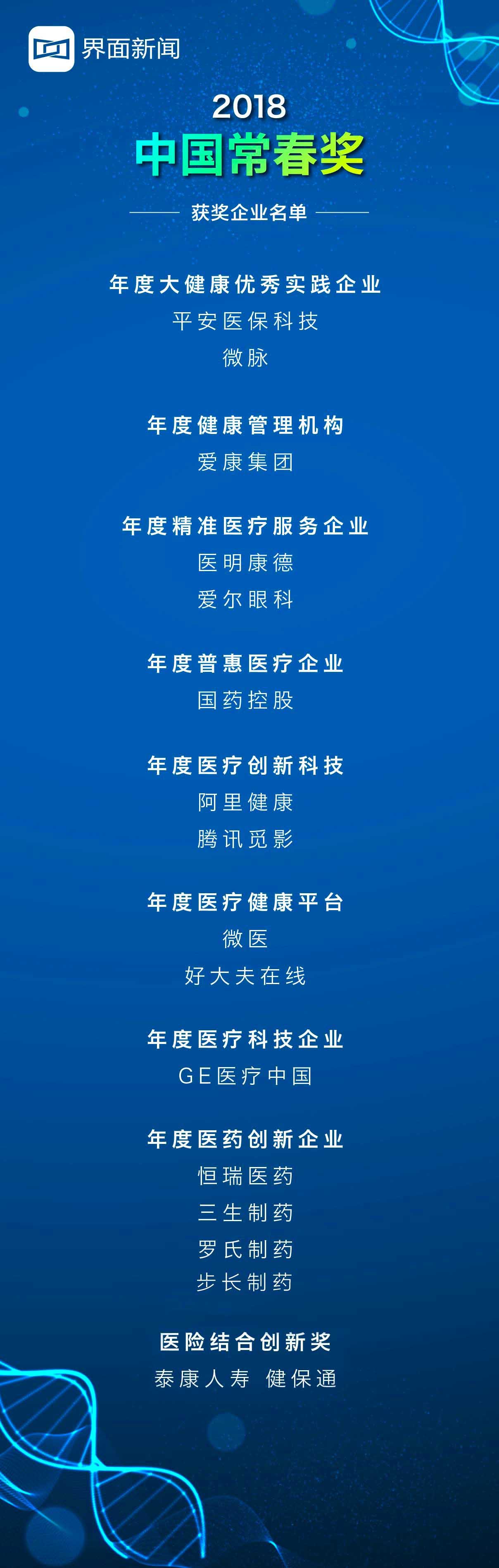 年度大健康优秀实践企业——平安医保科技、微脉;年度健康管理机构——爱康集团;年度精准医疗服务企业——医明康德、爱尔眼科;年度普惠医疗企业——国药控股;年度医疗创新科技——阿里健康、腾讯觅影;年度医疗健康平台——微医、好大夫在线;年度医疗科技企业——GE医疗中国;年度医药创新企业——恒瑞医药、三生制药、罗氏制药、步长制药;医险结合创新奖——泰康人寿 健保通。