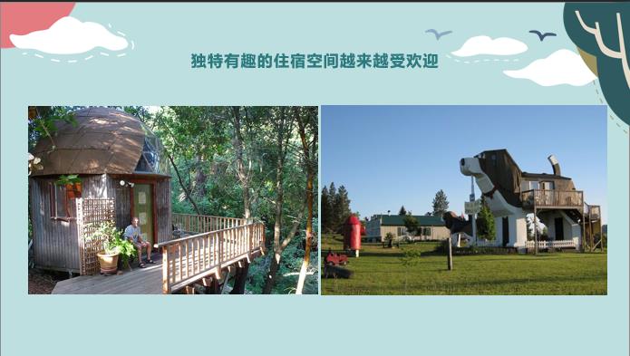 第一,大家出行的时候,希望找到独特有趣的房子。在爱彼迎上预定最多的,一个是蘑菇房,一个是狗狗外形的房子。这个房子在爱彼迎上要提前一年才能预定,现在只能定到2020年了。所以这些都体现了大家对个性的追求。