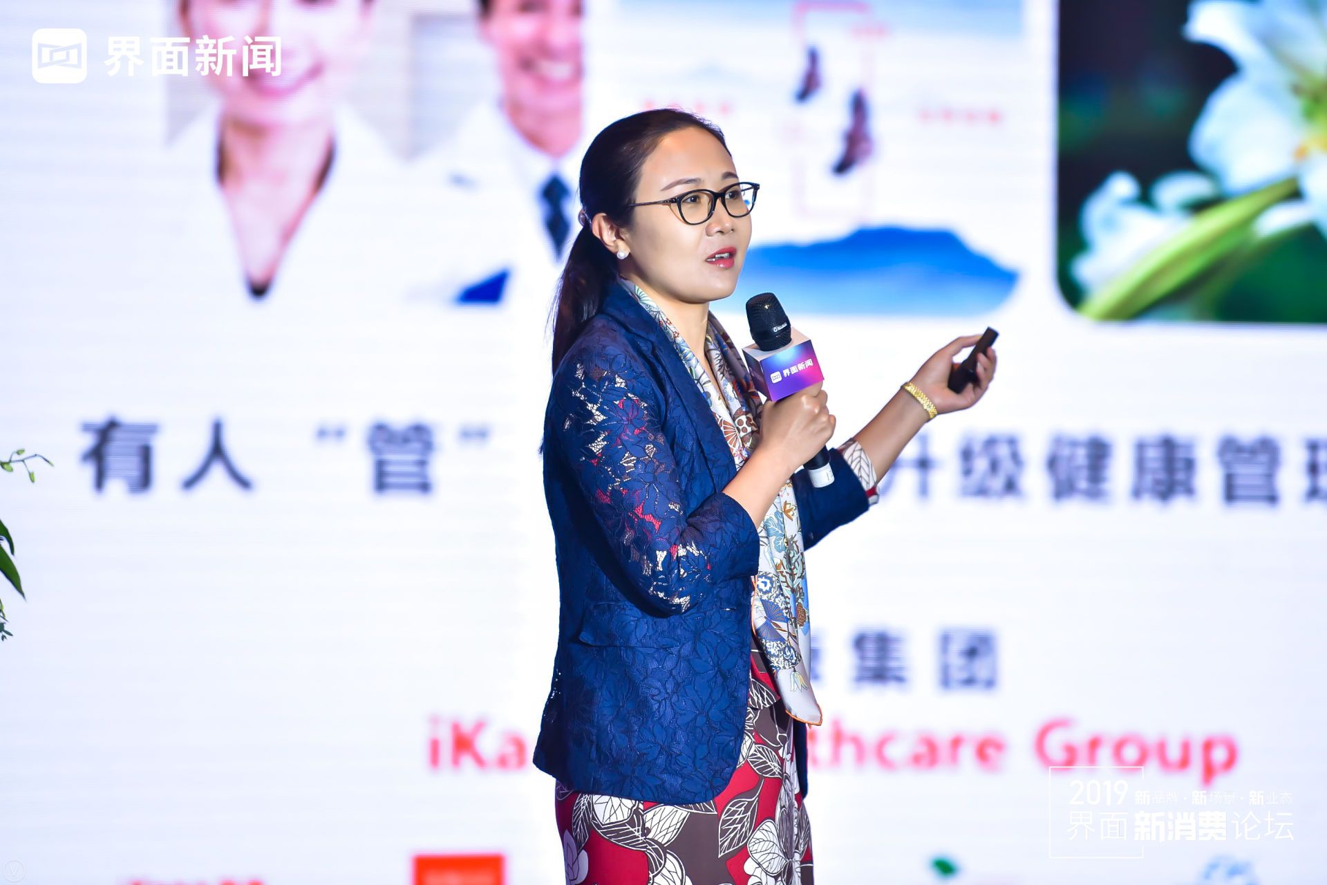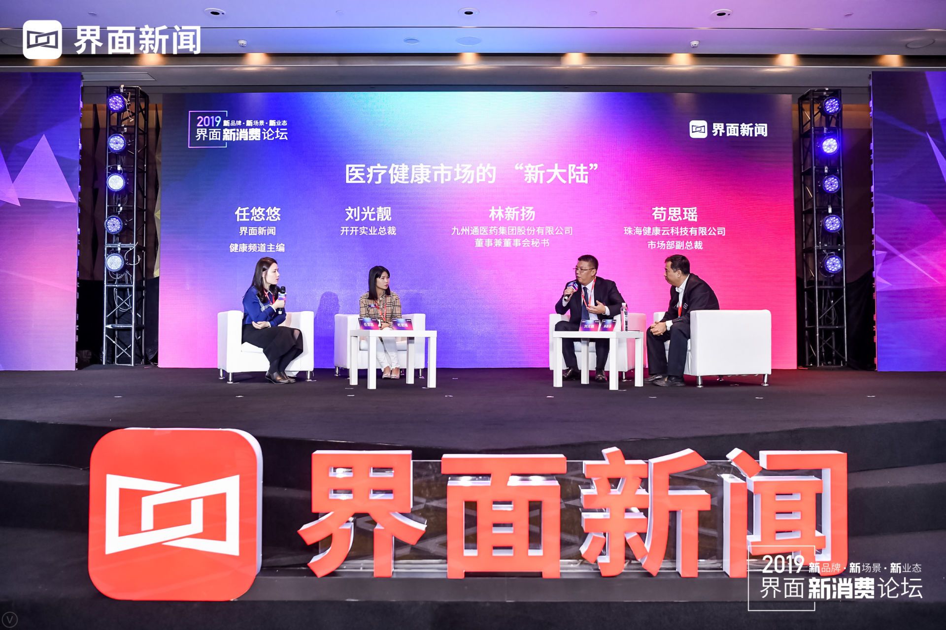 在下午的健康圆桌,界面新闻健康频道总监任悠悠主持对话,开开实业总裁刘光靓先生、九州通医药集团股份有限公司董事兼董事会秘书林新扬先生、珠海健康云科技有限公司市场部副总裁苟思瑶女士由医药新政切入,延伸到健康消费领域的未来发展。