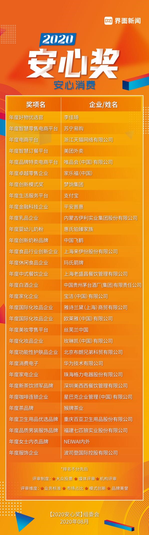 【2020安心奖】旨在鼓励新消费时代浪潮下,专注于技术、品牌、营销和服务多个方面全面升级、蓄力于转型升级的优质企业,致敬他们为推动中国消费领域的发展进步所做出的重要贡献。经过6个月的激烈角逐,综合桌面调研、数据筛选、自主申报、专家推荐、企业信息调查及大众投票的结果,最终有30家企业以细分品类中的出色表现脱颖而出,斩获大奖。