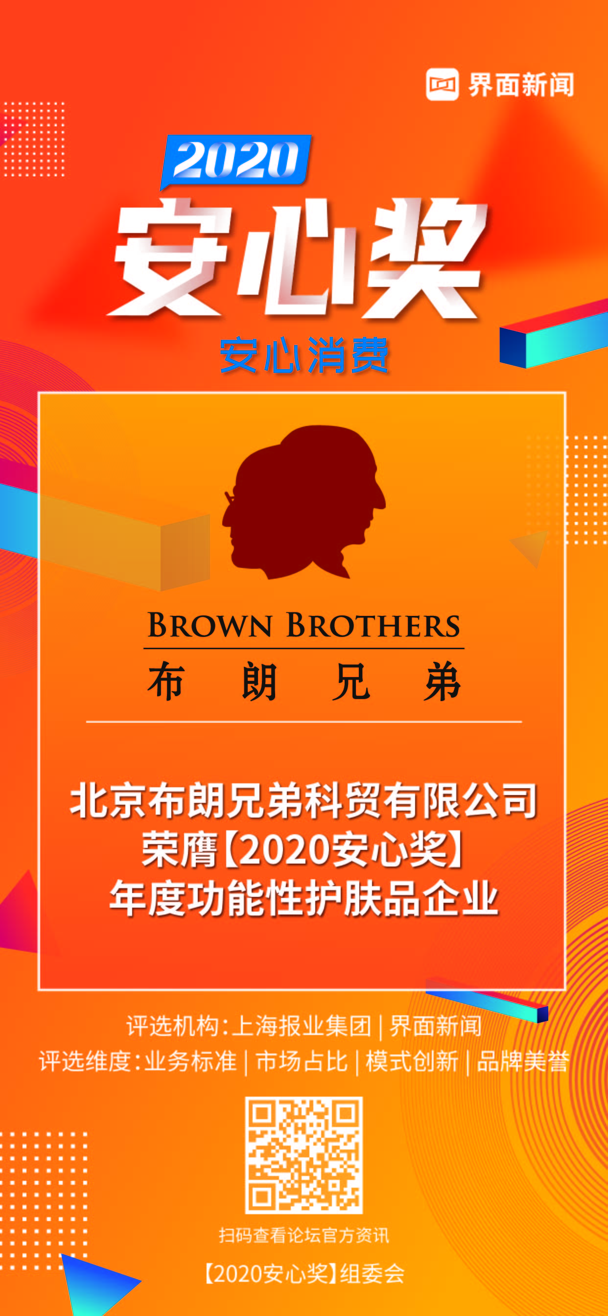 8月27日,上海报业集团l界面新闻在上海鲁能JW万豪侯爵酒店举办了【2020安心奖】颁奖典礼,并正式公布了本年度获奖名单。围绕“安心消费”这一核心价值,来自电商、食品、饮品、美妆、白酒、餐饮等领域优秀企业,夺得了30项年度大奖。北京布朗兄弟科贸有限公司凭借高标准的产品要求和高品质的价值追求,荣膺年度功能性护肤品企业大奖。