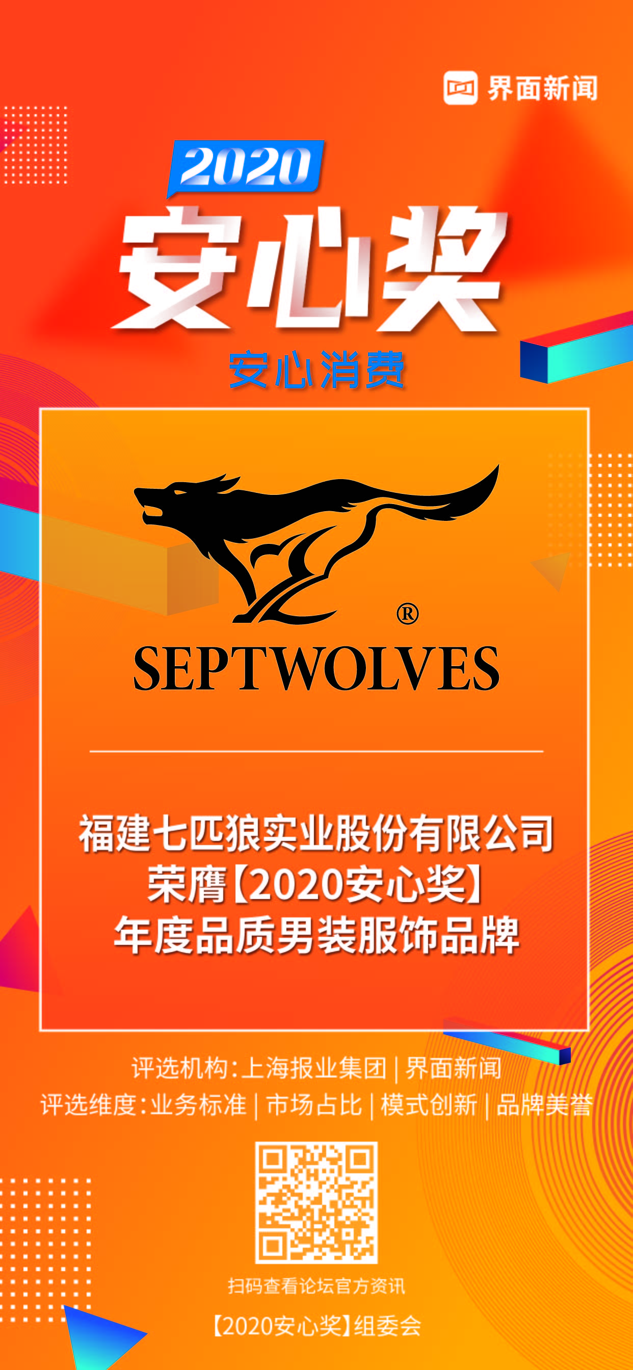 8月27日,上海报业集团l界面新闻在上海鲁能JW万豪侯爵酒店举办了【2020安心奖】颁奖典礼,并正式公布了本年度获奖名单。围绕“安心消费”这一核心价值,来自电商、食品、饮品、美妆、白酒、餐饮等领域优秀企业,夺得了30项年度大奖。福建七匹狼实业股份有限公司凭借其原创的品质产品和品牌格调,荣膺年度品质男装服饰品牌大奖。